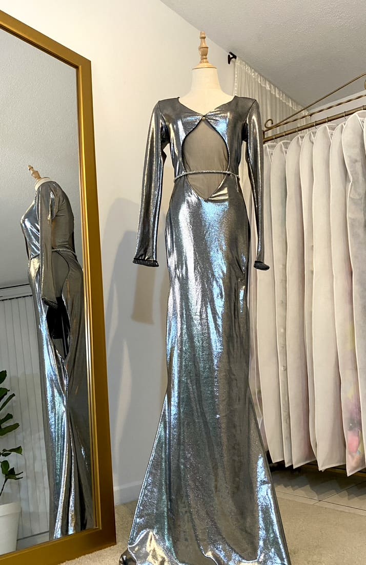 Maxi dress en lycra metalizada con transparencias corte sirena.