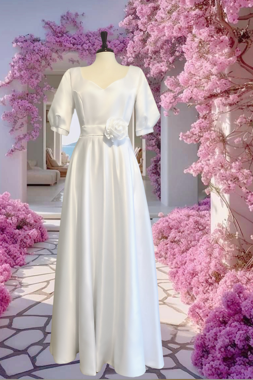 Maxi Dress en raso novia, corte semicircular con tocado de rosa en la cintura.